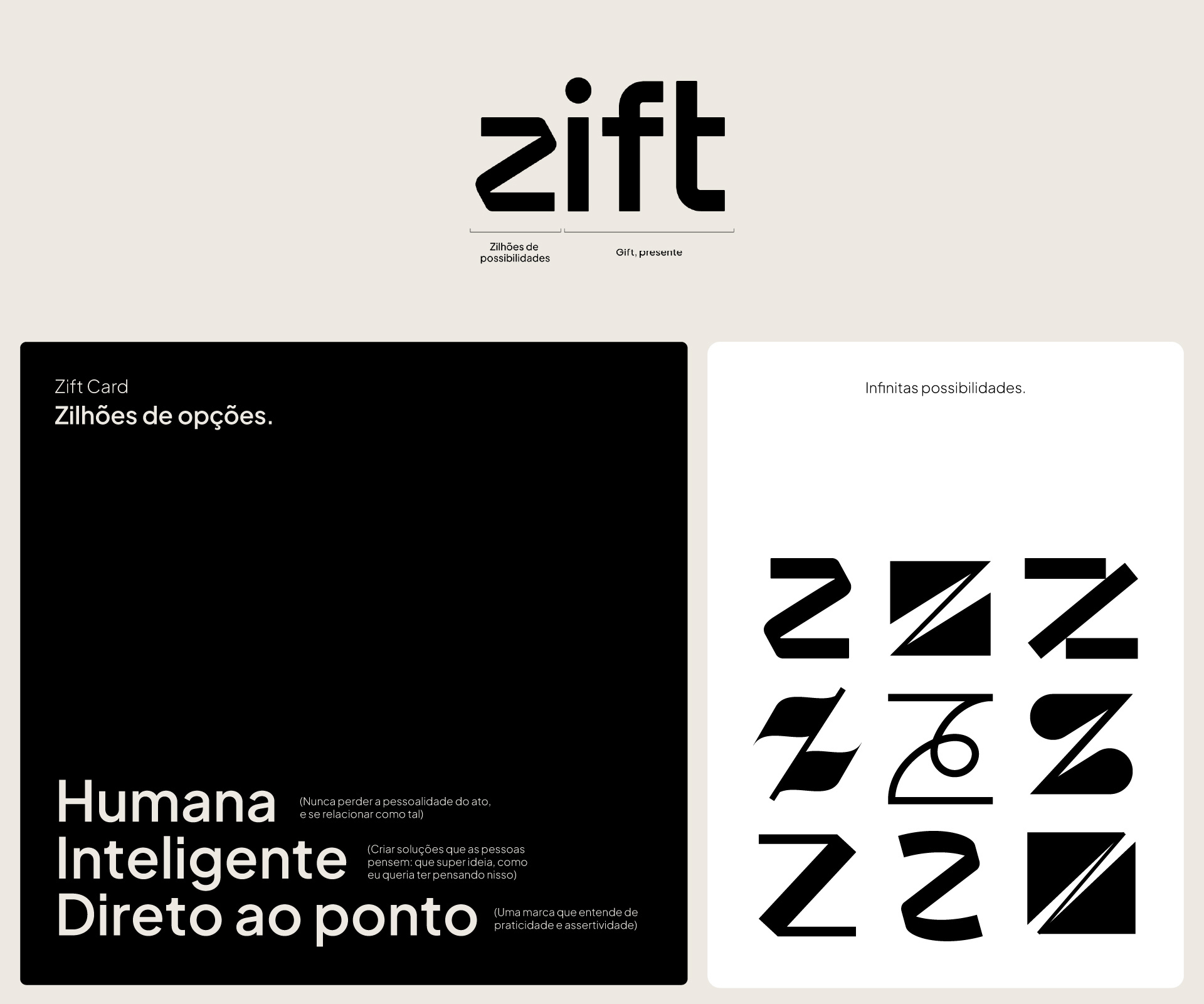 O z é utilizado coloquialmente em zilhões e, quando está junto da palavra gift, representa as infinitas possibilidades de presentes. Assim chegamos no nome Zift com boa pronúncia e sonoridade. Além disso, é um nome que está pronto para expandir para diferentes mercados.